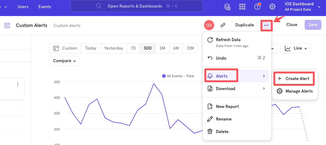 • While custom alerts are available on any insights or funnel report, at the moment, anomaly detection alerts are only available on insights reports using a time series visualization.